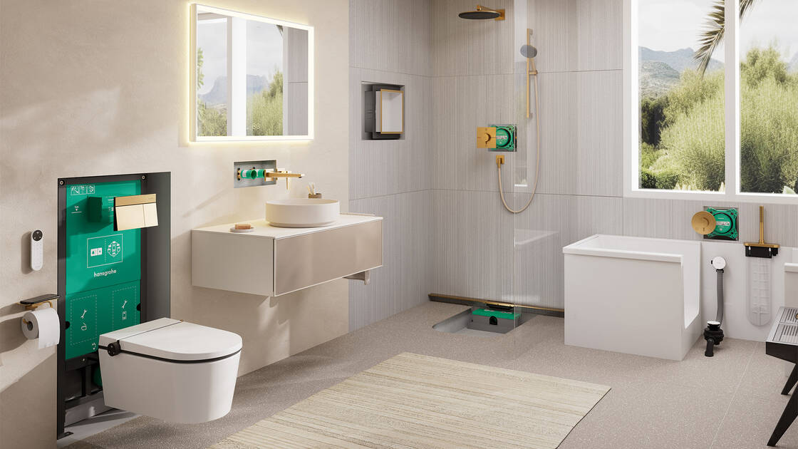 iFrame universal-innbyggingssisternen føyer seg sømløst inn i ethvert hansgrohe toalettområde – enten det er klassisk toalett eller dusjtoalett. Takket være flere tiår med hansgrohes ekspertise når det gjelder skjulte løsninger bak veggen, tilbyr iFrame en pålitelig og fremfor alt langvarig løsning. Skjult bak en vegg med stilige fliser eller elegant gips fullfører iFrame drømmebaderommet ditt. Mer om Sisterner